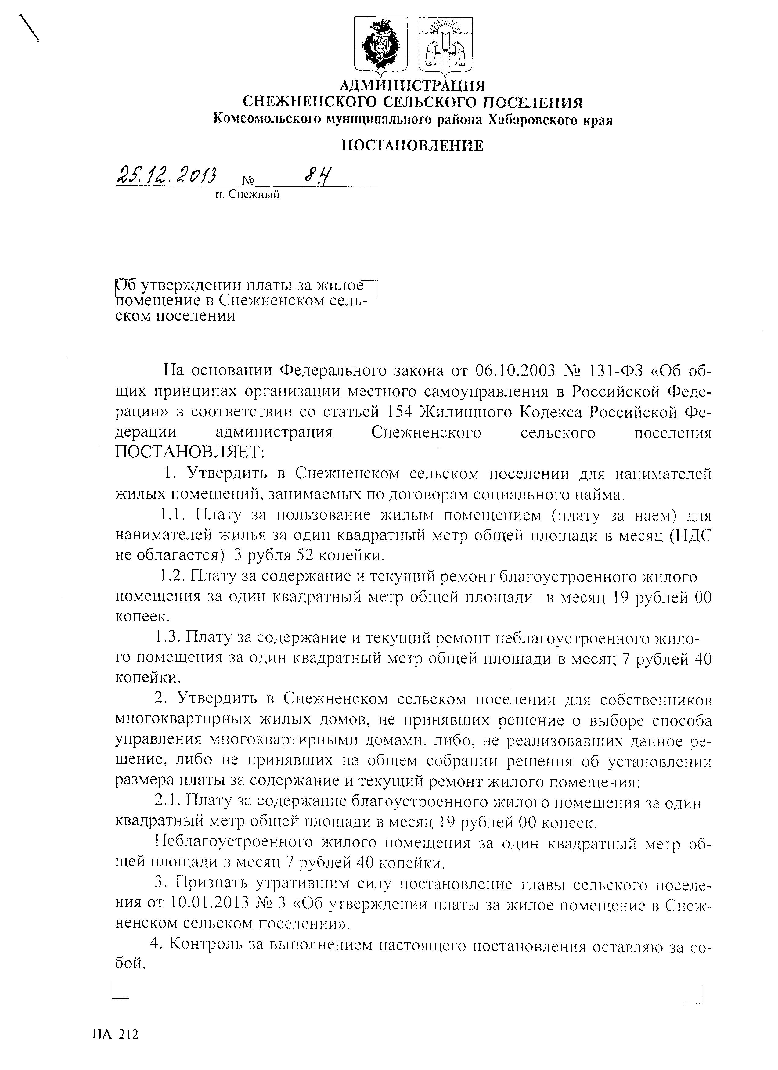 Об утверждении платы за жилое помещение в Снежненском поселении (от 25.12.2013 г) Подробности Автор: Super User